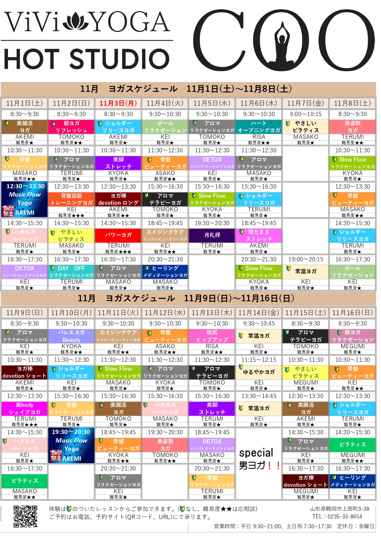 ホットヨガスケジュール 11月1日~11月16日