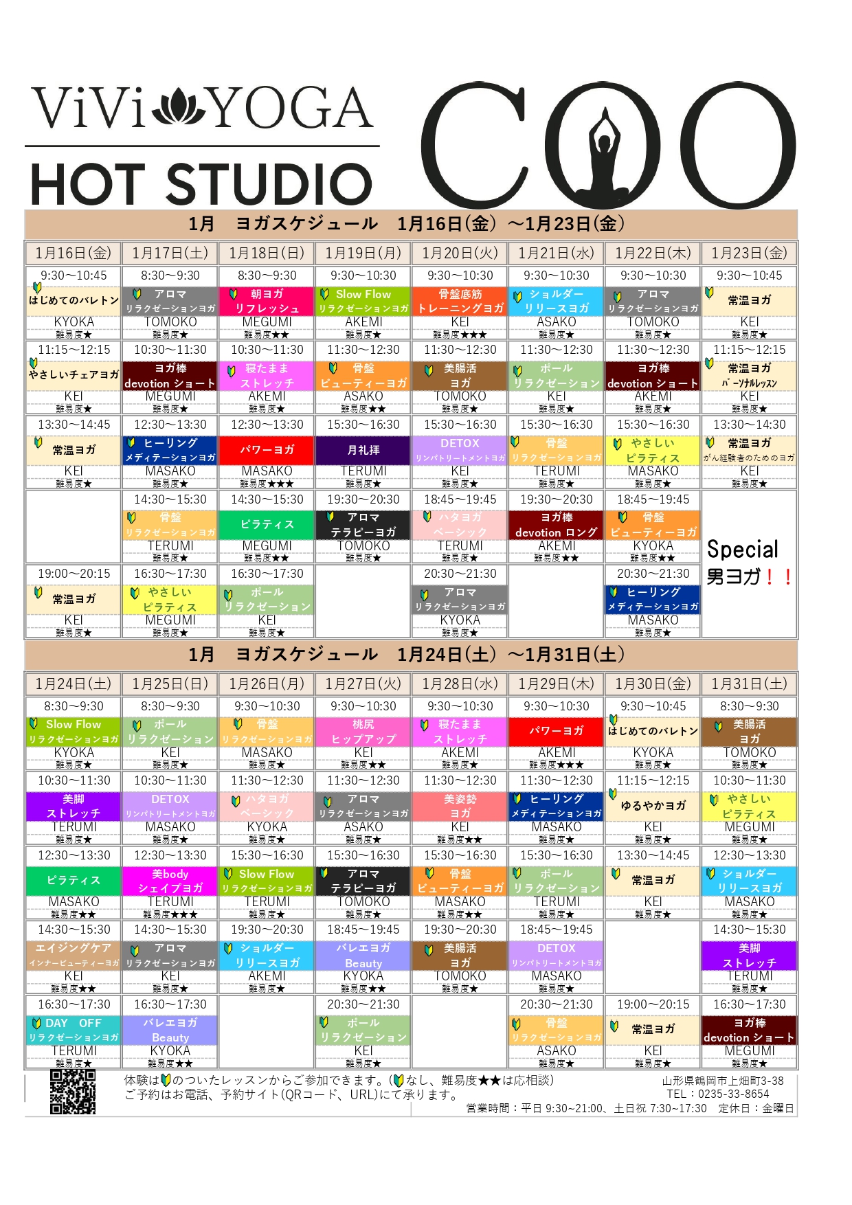 ホットヨガスケジュール 2026年1月16日~31日