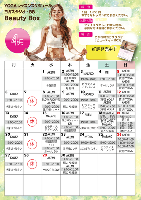 4月「Beauty Box ヨガスケジュール」